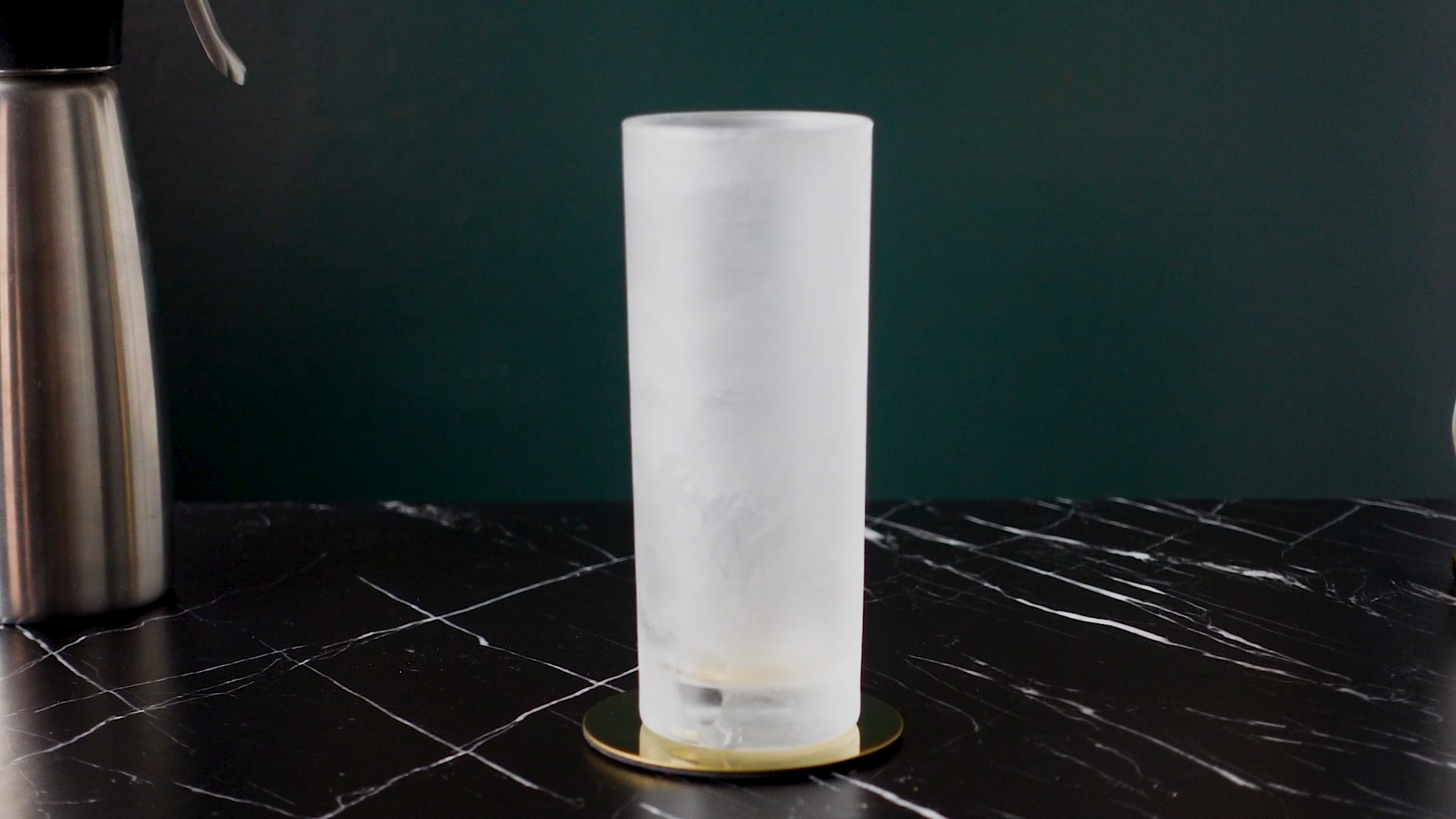 Add 1 oz of club soda to the frozen Collins glass. Pull the trigger on the cream whipper directly into the glass.