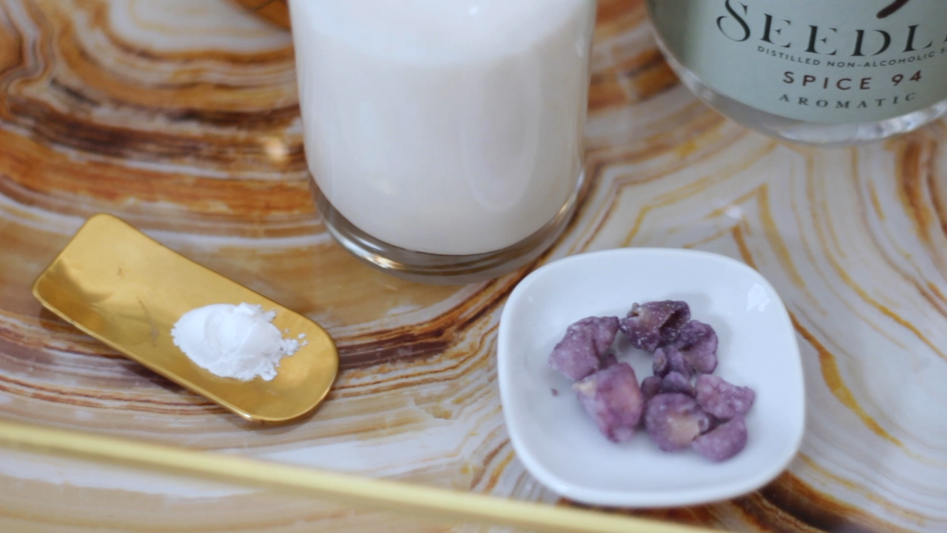 I will be using Seedlip Spice as the non alcoholic base spirt for this drink, along with butterfly pea flower tea, simple syrup, cream of tartar, Club Soda, and the aforementioned oatmilk creamer and aquafaba. For garnish, I had some candied violets that I’ve blitzed into a fine powder.